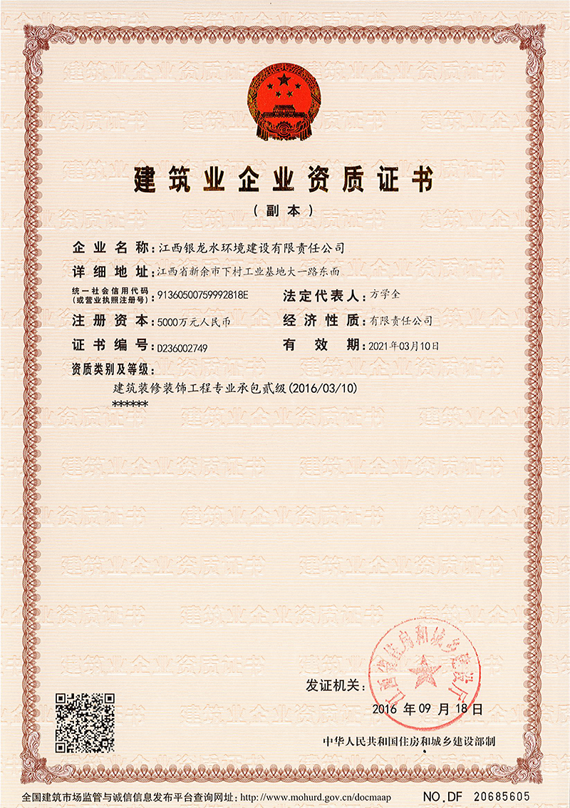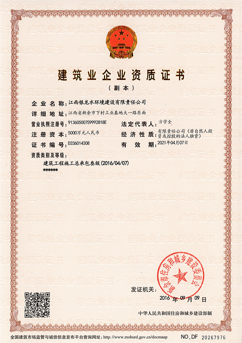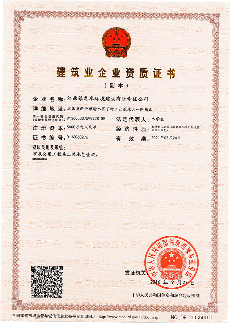 江西銀龍水環(huán)境建設有限責任公司是一家具備市政公用工程施工總承包壹級、裝飾工程專(zhuān)業(yè)承包貳級、屋房建筑工程施工總承包叁級資質(zhì)的大型企業(yè)集團。公司成立于2004年,注冊資金為10億元人民幣,主要從事市政工程建設,市政工程設計、咨詢(xún),水利水電工程建設,土木工程建設,建筑裝飾工程,綠化工程,工程設備及材料銷(xiāo)售和水污染治理等業(yè)務(wù)。公司于2017年通過(guò)了ISO國際質(zhì)量、環(huán)境、職業(yè)健康與安全三個(gè)體系認證。