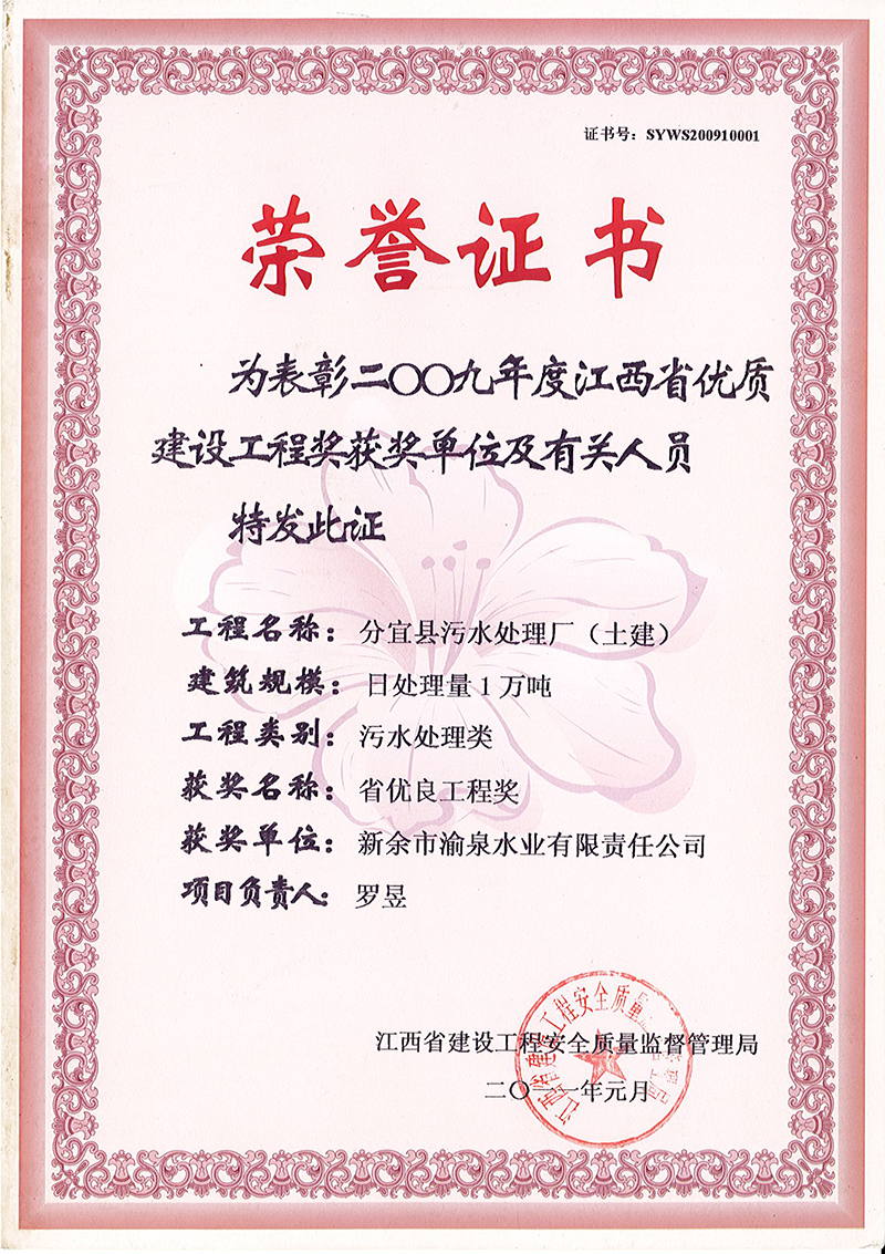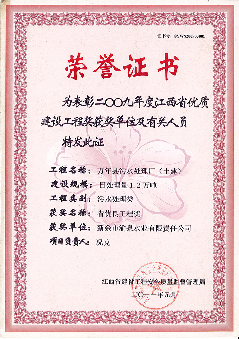 分宜縣污水處理廠(chǎng)獲2009年度江西省優(yōu)秀工程建設獎、萬(wàn)年縣污水處理廠(chǎng)獲2009年度江西省優(yōu)秀工程建設獎